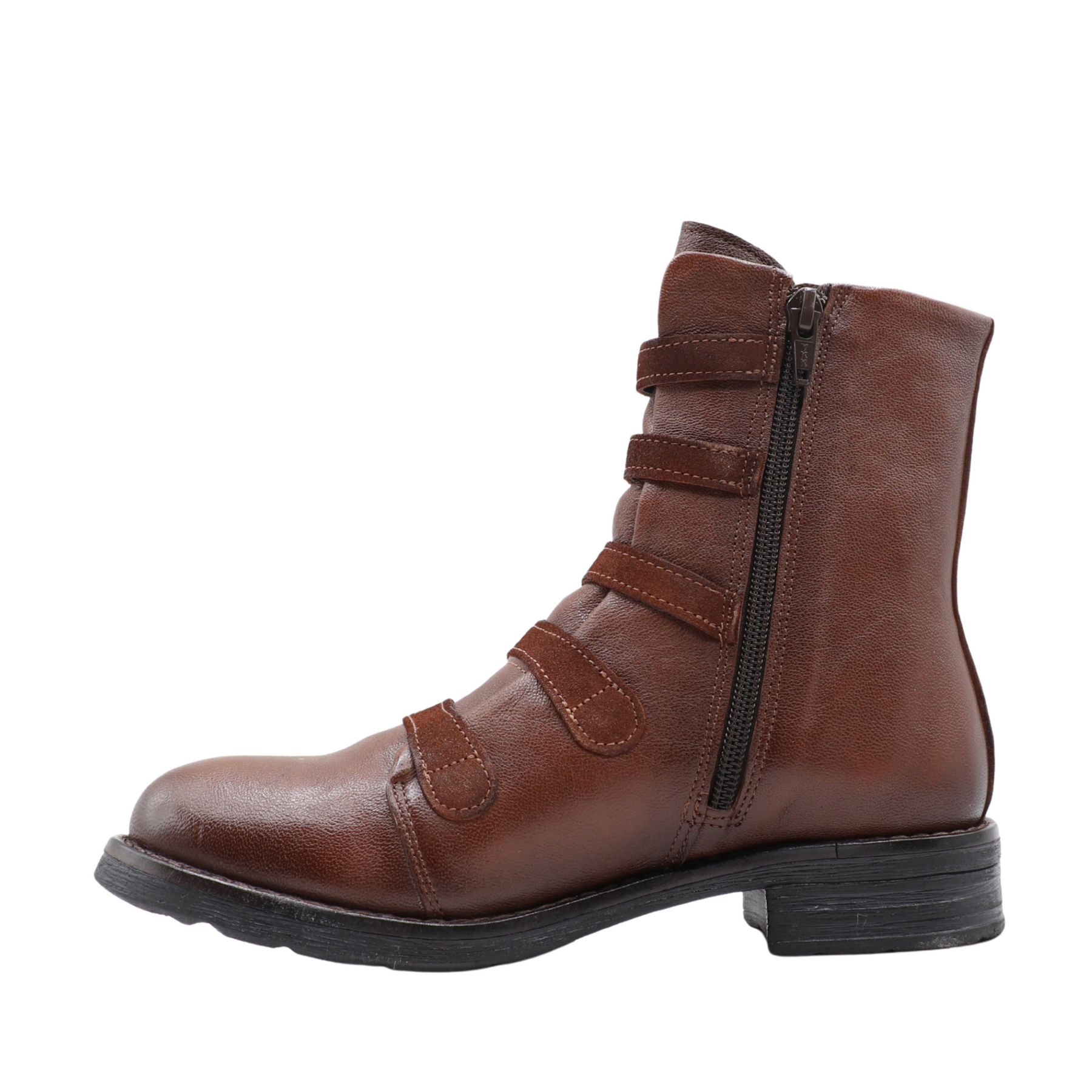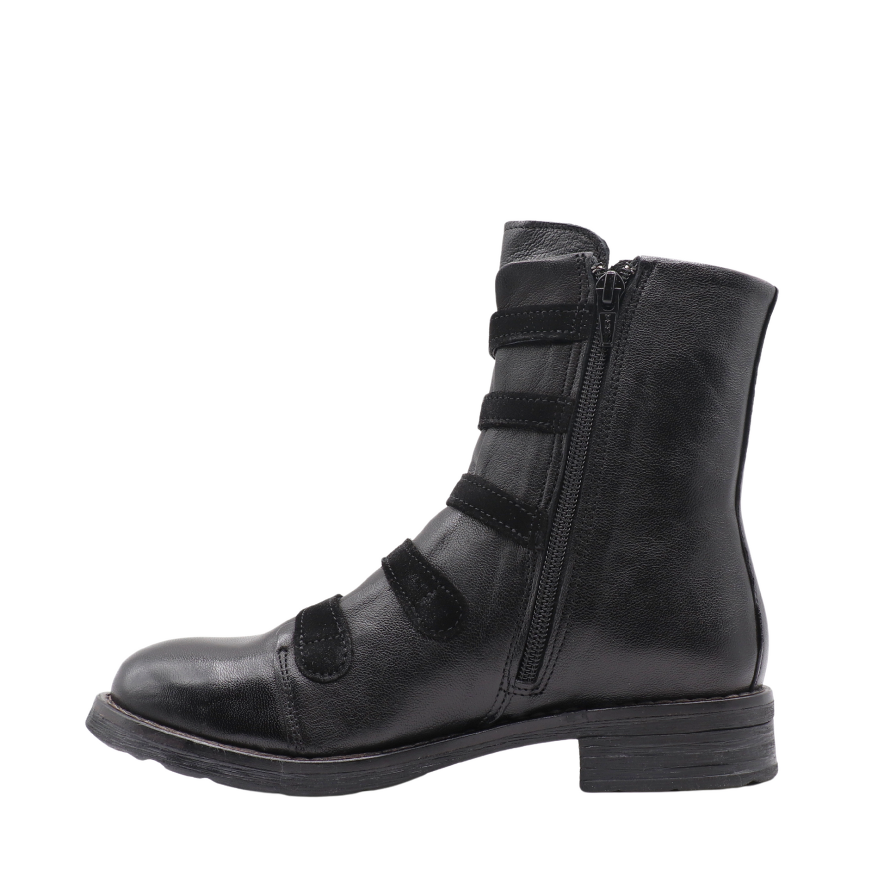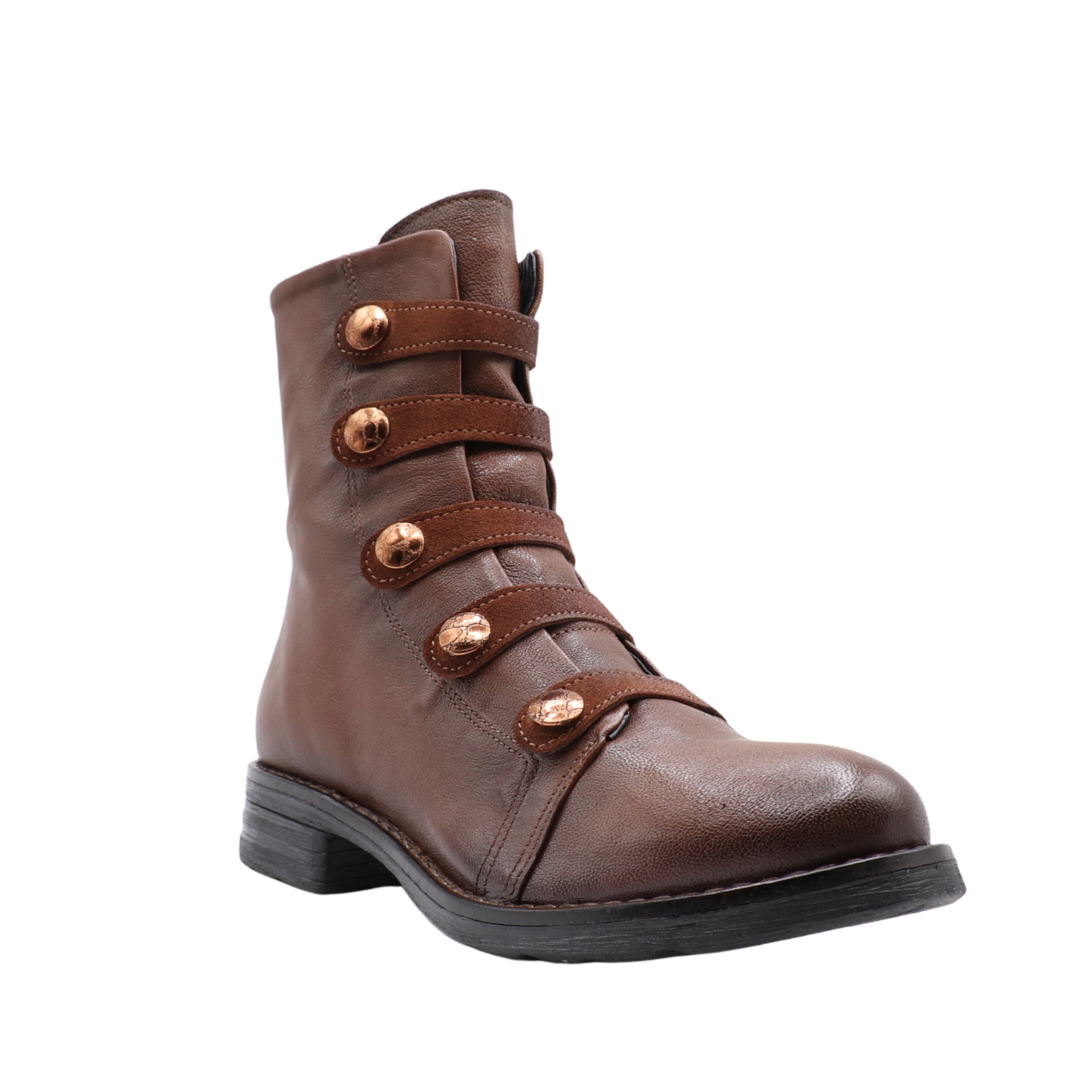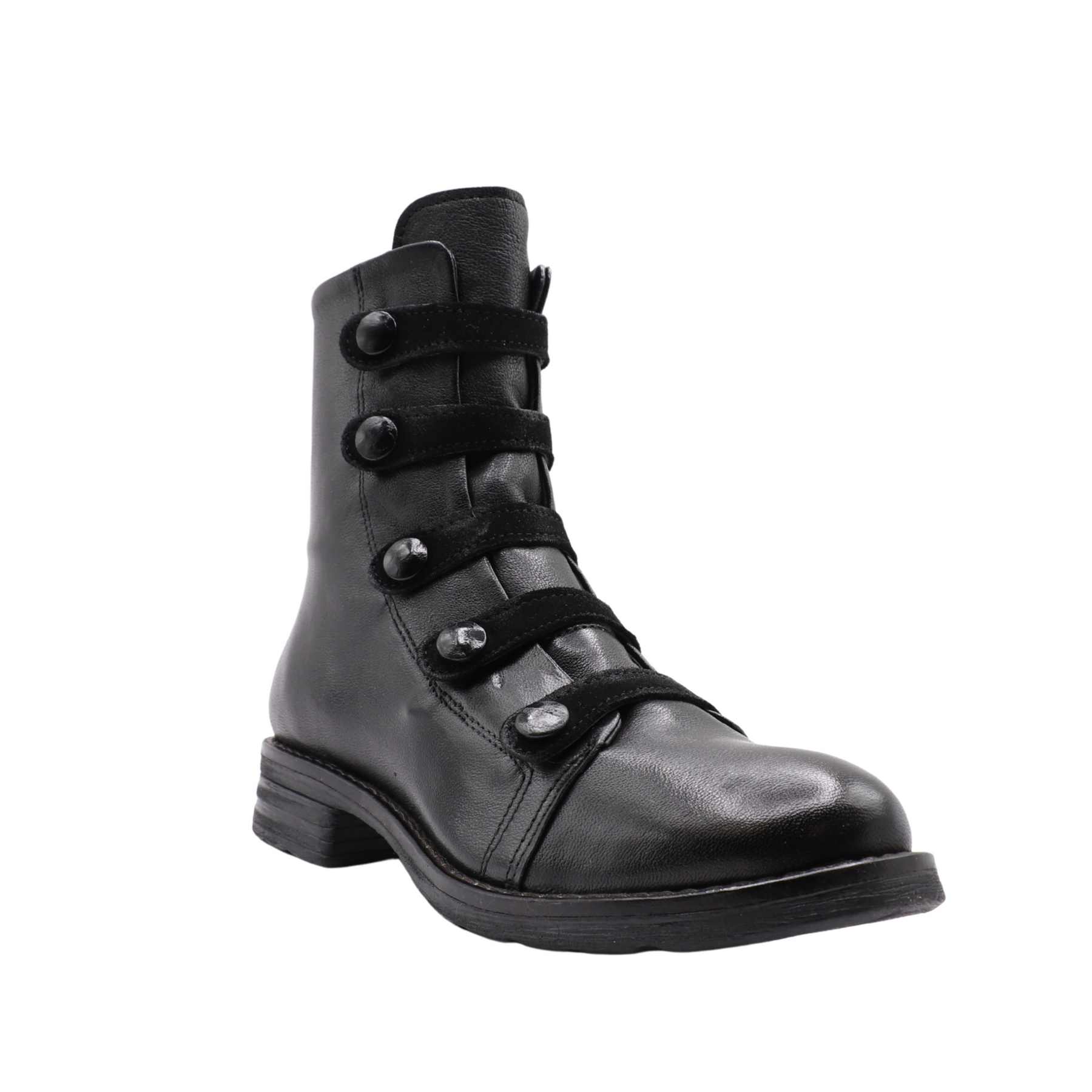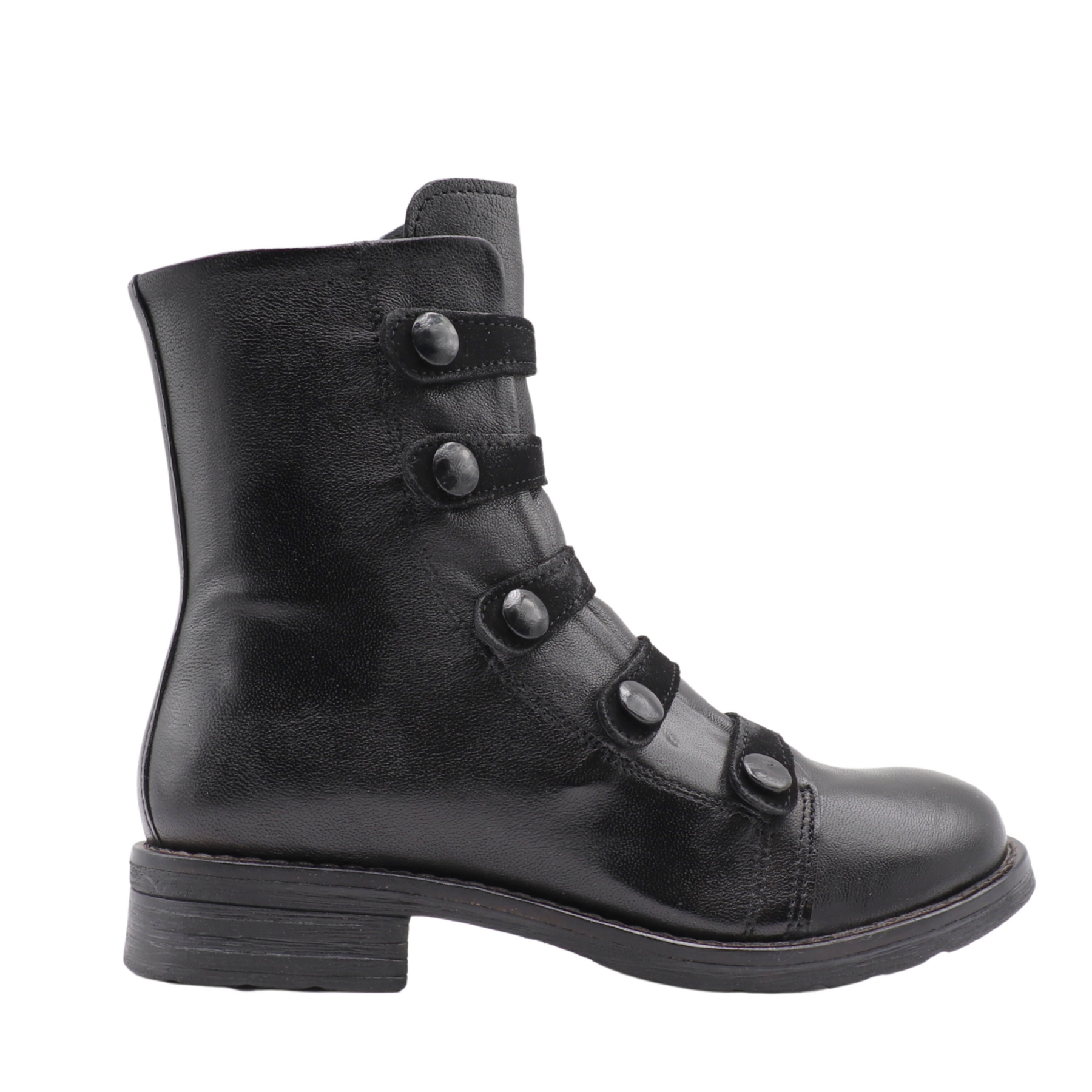 La botte QUIES combine style unique et praticité. Fabriquée au Portugal en cuir véritable, elle se distingue par ses bandes décoratives à boutons métalliques qui lui confèrent un look audacieux et raffiné.