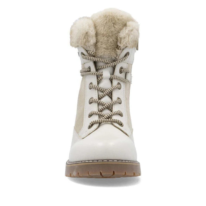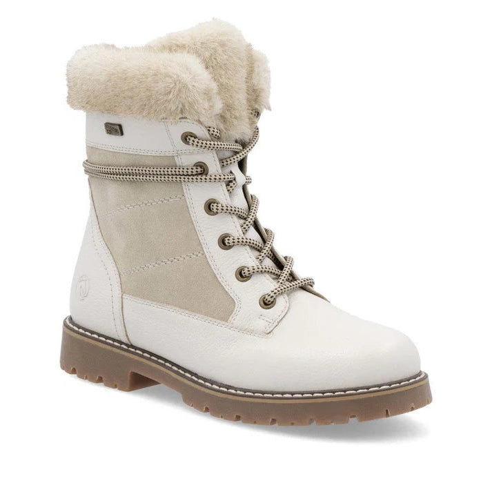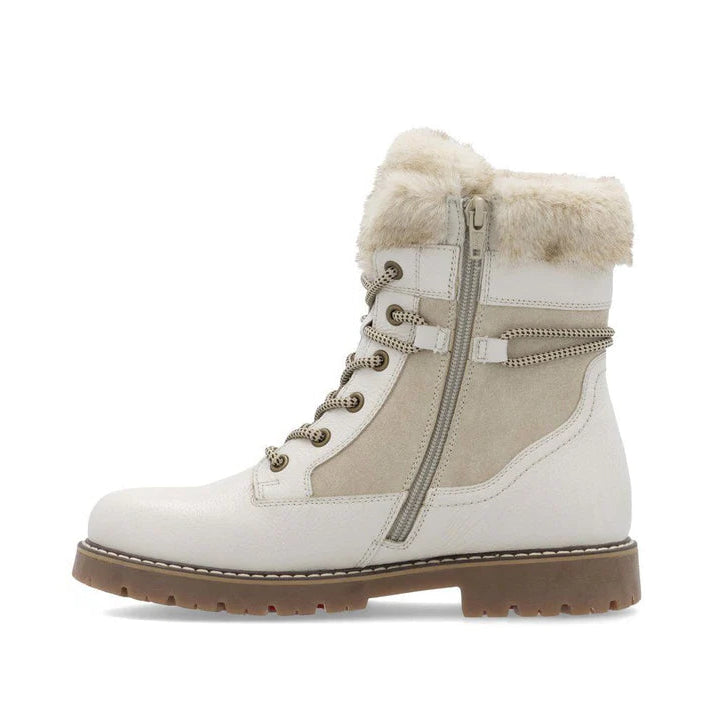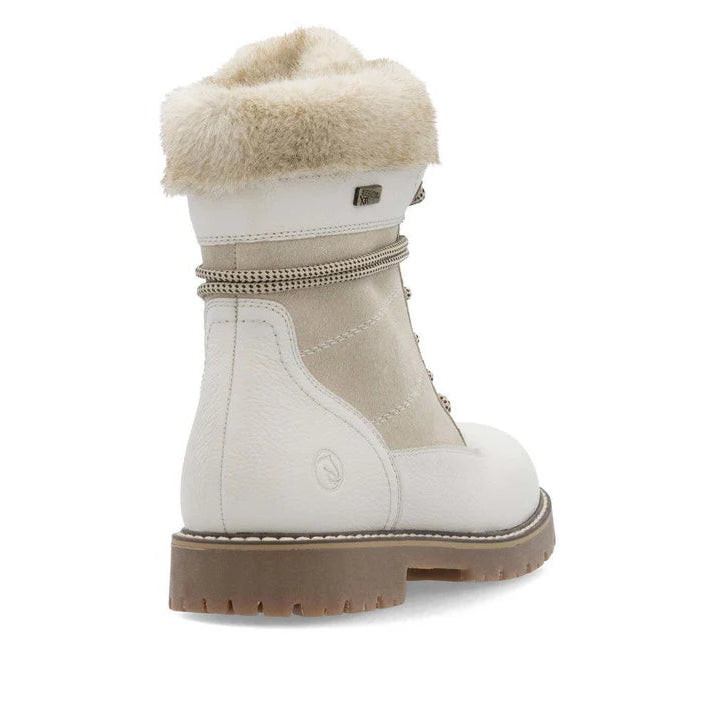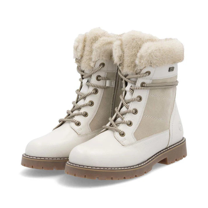 Style et confort : le duo de rêve de la saison ! Avec ces bottines à lacets Remonte noir nuit en cuir lisse, vous serez à la fois cool et décontractée, tout en étant élégante. L'association astucieuse du laçage et de la fermeture éclair facilite l'enfilage et le retrait. Le col en fourrure sur la tige attire tous les regards. La semelle à talon bloc, amortissante et adhérente, assure une bonne adhérence en toutes circonstances. La largeur confort G offre une plus grande liberté de mouvement aux orteils. Grâce à la membrane remonteTEX, l'intérieur de la chaussure reste sec, tandis que les crampons Flip-Grip offrent une adhérence optimale sur les surfaces glissantes et que la semelle intérieure thermique assure la chaleur. Grâce à la laine vierge douillette et très chaude, le froid n'a aucune chance.