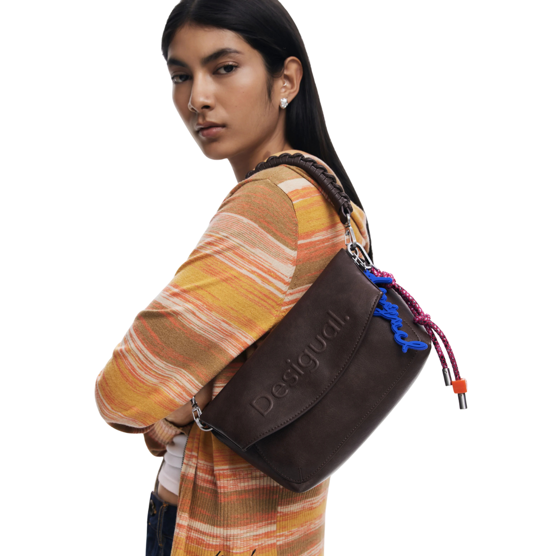 Sac bandoulière en similicuir, avec logo en relief 3D, rabat extensible, détail porte-clés et anses interchangeables.