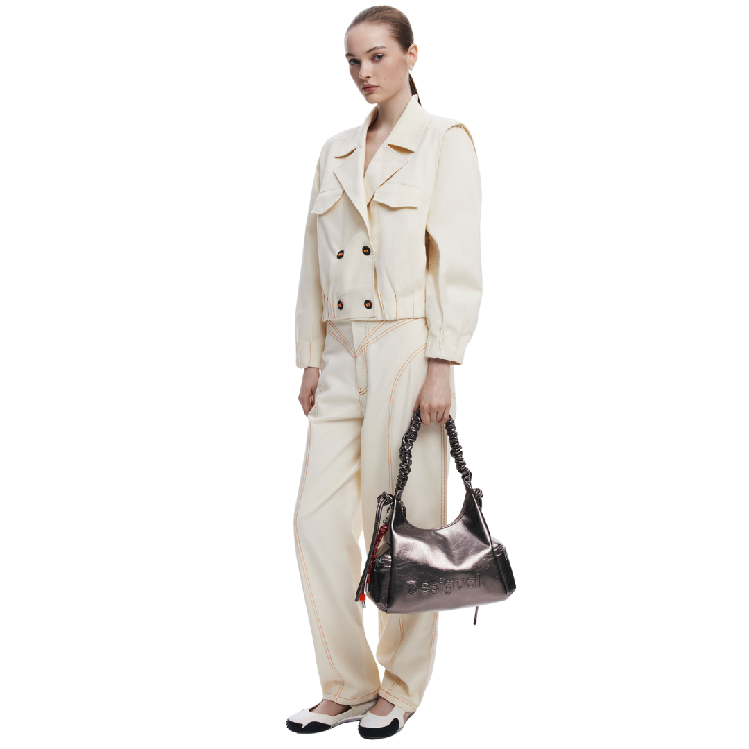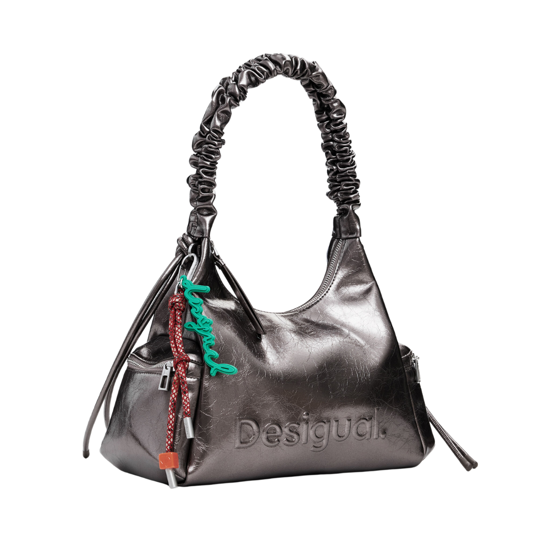 Sac à main de taille moyenne, en tissu effet cuir uni avec finition métallisée, logo effet 3D, anse réglable avec fronces et détail de porte-clés amovible