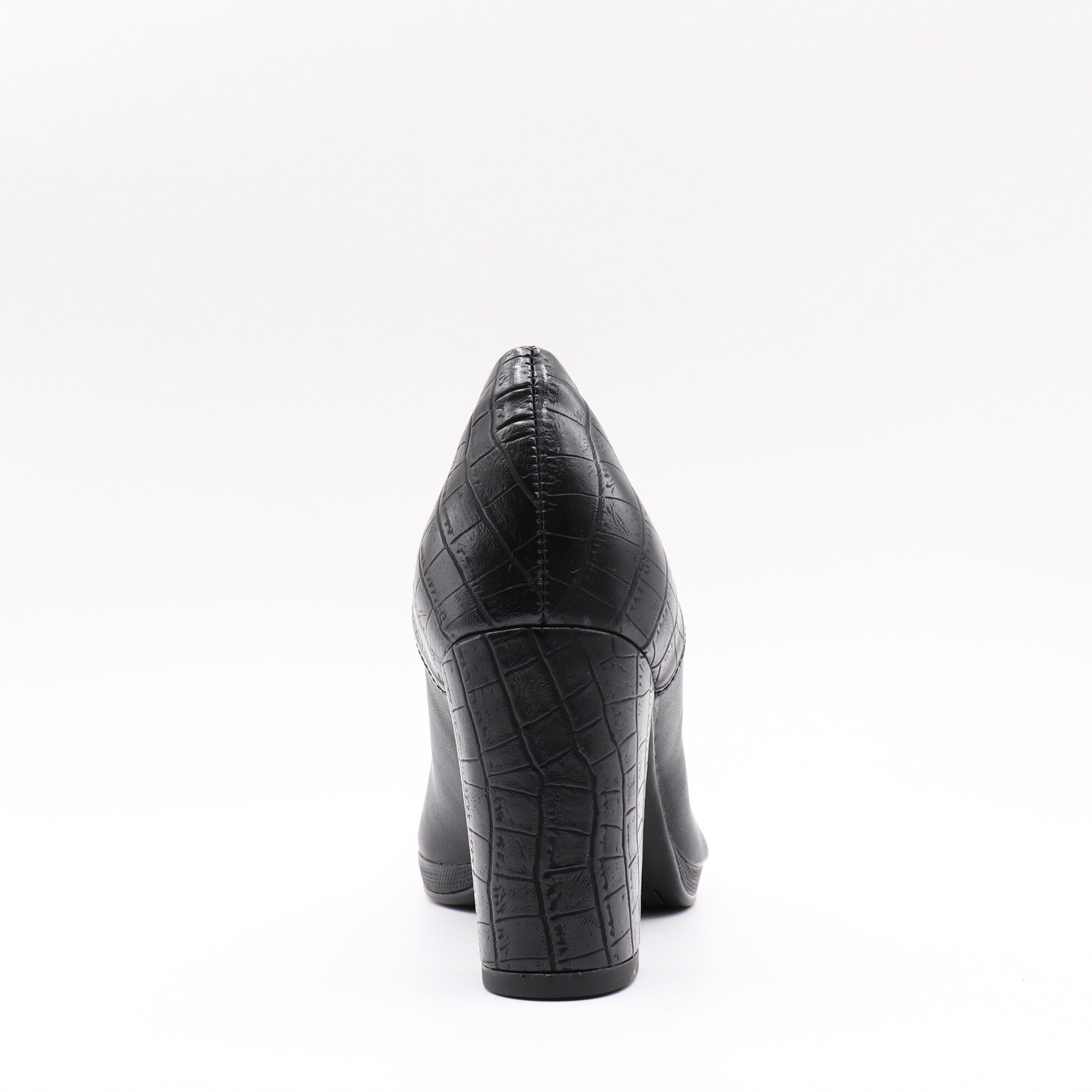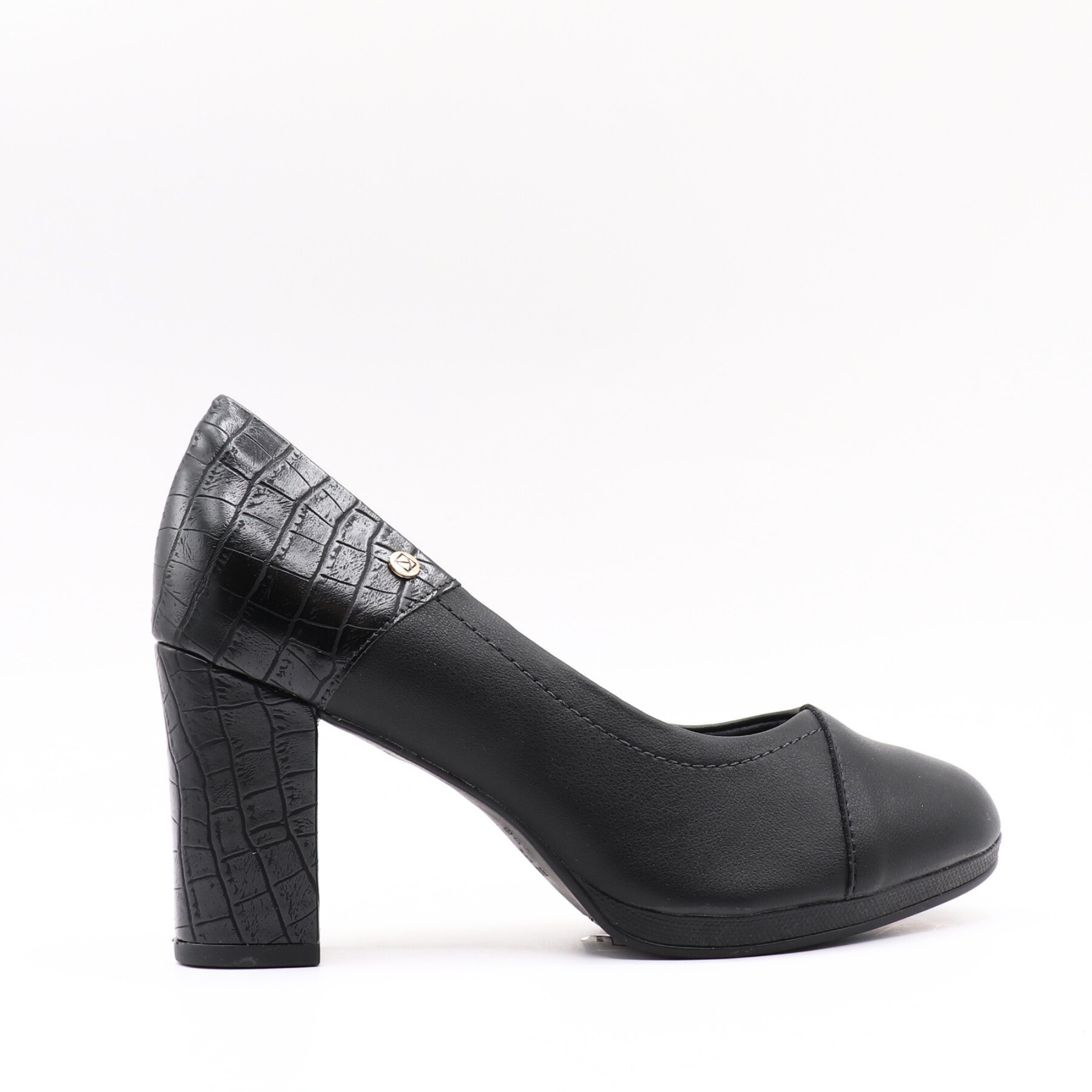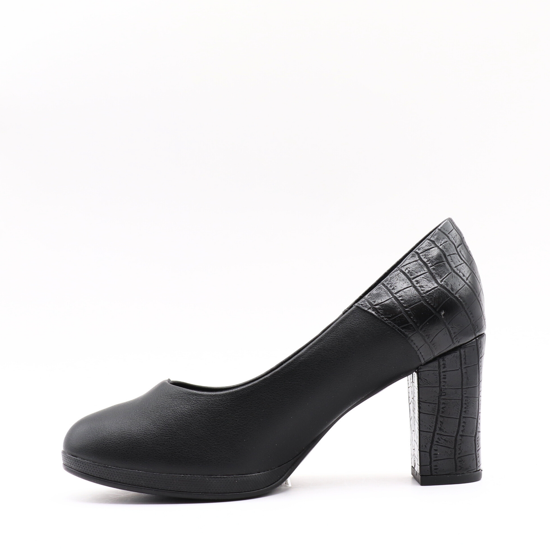 Un escarpin moderne qui allie élégance et confort. Conçu en matière synthétique, il se distingue par son talon bloc recouvert d’un effet croco noir, qui apporte une touche sophistiquée et tendance. Son bout arrondi et sa semelle souple garantissent un confort optimal, idéal pour les journées actives comme pour les soirées.