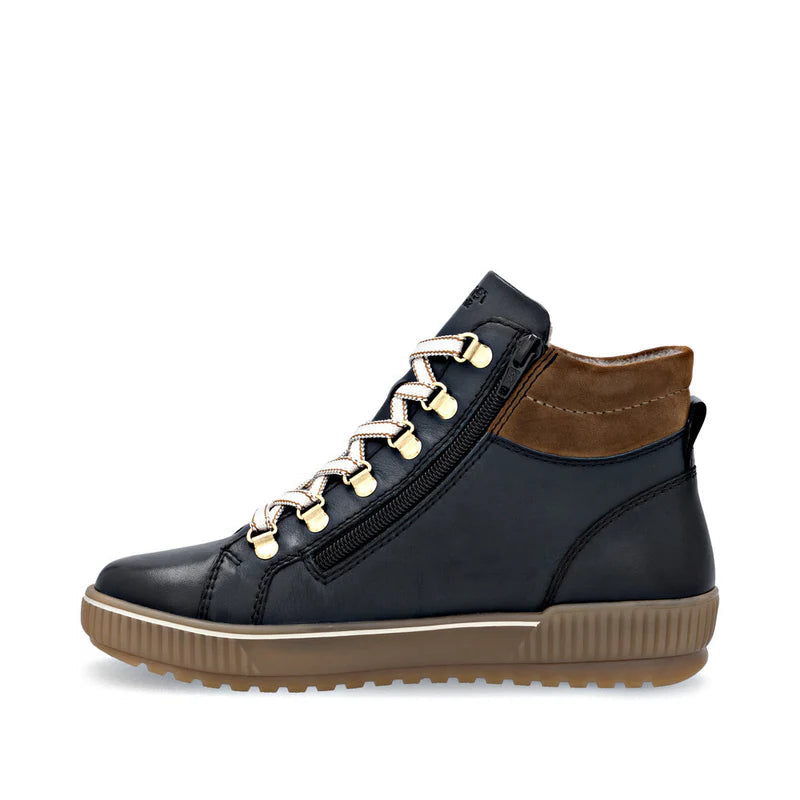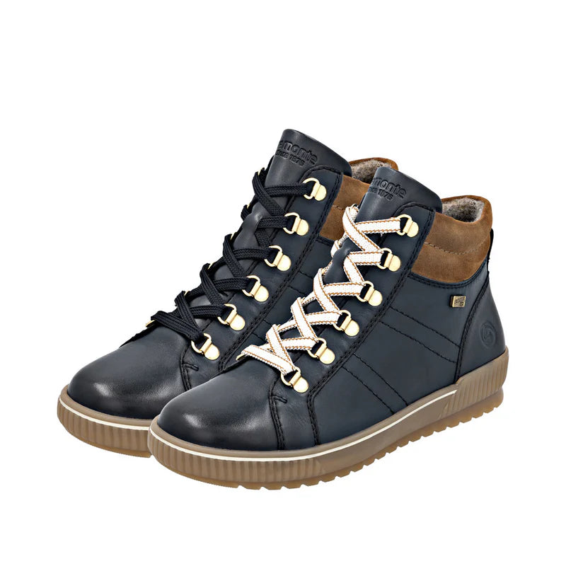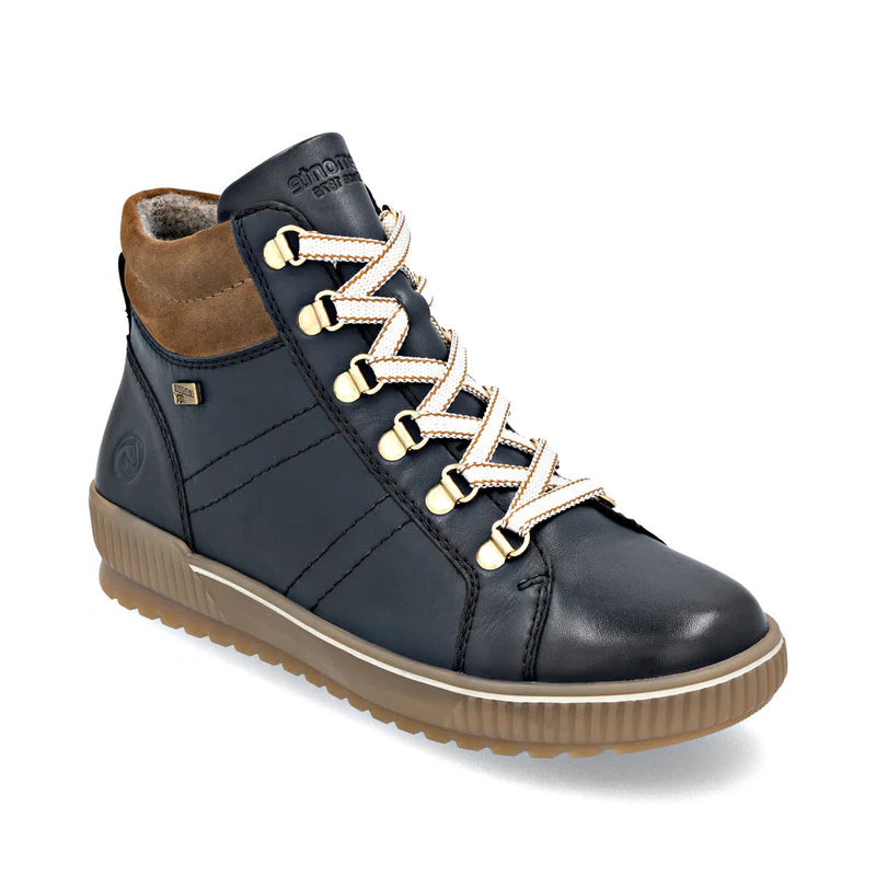 Plus d’espace pour les pieds ! Ces bottines bleu brun à lacets de la marque remonte, fabriquées en cuir lisse, maîtrisent parfaitement l'art du style. La combinaison ingénieuse entre les lacets et la fermeture éclair permet d’enfiler et de retirer la chaussure facilement. De plus, des lacets de rechange sont inclus. La semelle intérieure rembourrée et amovible rencontre une semelle flexible et amortissante qui compense à merveille les sols durs. Ce modèle offre une liberté de mouvement supplémentaire grâce à sa largeur confort. Grâce à la technologie remonteTEX, la chaussure est déperlante et protège du vent. Impossible d’obtenir plus de style que ça !
