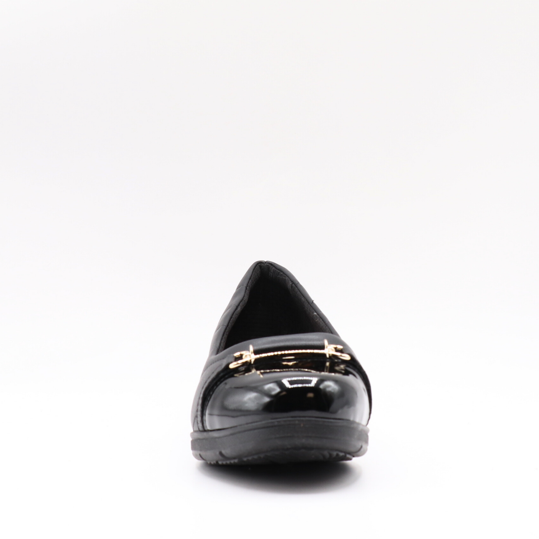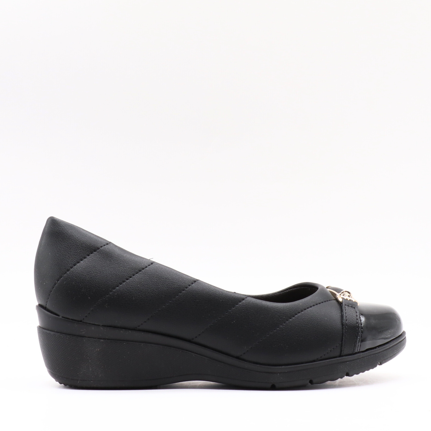 Un soulier confortable au look chic-décontracté. Conçu en matière synthétique, il se distingue par son bout verni noir orné d’un détail métallique doré, ainsi que par ses surpiqûres latérales discrètes. Sa semelle compensée assure un confort optimal et un bon maintien tout au long de la journée, idéal pour un usage quotidien.